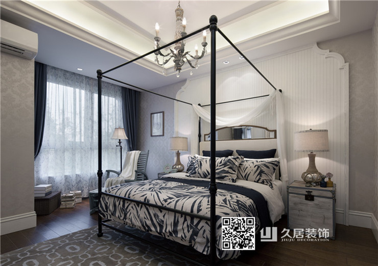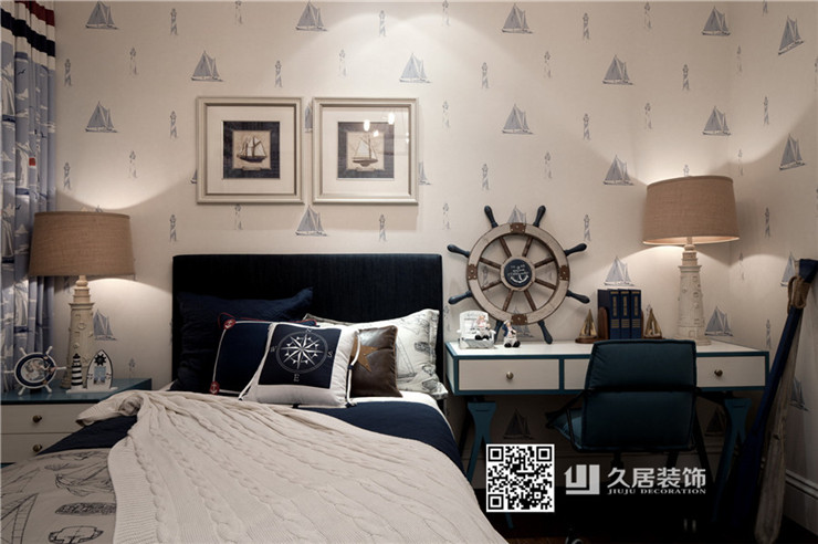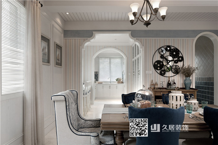本案設計彰顯典雅、浪漫的地中海風情。采用地中海典型的藍白色為基調(diào),利用回游空間的手法將空間流線合理化。 客餐廳:空間運用天花橫梁處理與抽槽的的設計手法,避免了原建筑結構的弱點,將天花最高點釋放,擴大了整個空間的體驗感與舒適感。設計有意將地中海建筑風格中的拱形門用白色開放漆飾面代替了白灰泥墻的建筑特點,在室內(nèi)空間細致的表現(xiàn)出來??筒蛷d地面采用爵士白大理石為主色調(diào),用藍白馬賽克波打與精致的藍色小方磚為點綴。 廚房衛(wèi)生間:藍色仿古磚與彩色仿古磚腰線在廚房及衛(wèi)生間的合理運用將地中海風格表現(xiàn)得淋漓盡致。 臥室:空間上大面積的藍與白,軟裝配飾局部的米色搭配,清澈無瑕,詮釋著人們對藍天白云,碧海銀沙的無盡渴望。帶有迷藏感的空間格局,提供給居者不同的心理感受。
